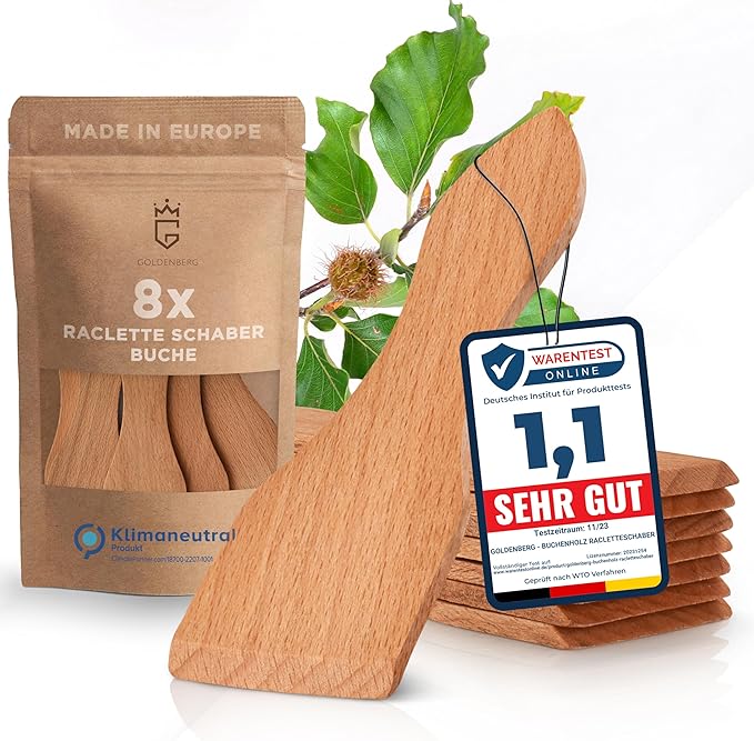 Dieses 8er Set Raclette-Schaber ist die beste und kratzfreie Alternative zu herkömmlichen Kunststoff-Schabern. Die Spachtel bestehen aus feinstem Buchenholz aus Europa und sind durch den abschließenden Schliff und das Lebensmittelöl besonders langlebig. Der wichtigste ökologische USP: Das Produkt ist 100% Klimaneutral, da das entstandene CO2 durch ein Klimaprogramm ausgeglichen wird. Sie sind ideal, um die Pfännchen zu entleeren und die Antihaftbeschichtung zu schonen.