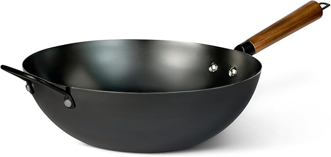 | Amazon Basics Wok | Karbonstahl (eingebrannt) | Allrounder / Induktion-Kompatibilität | Für alle Herdarten geeignet, Akazienholzgriff |