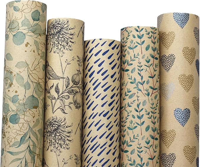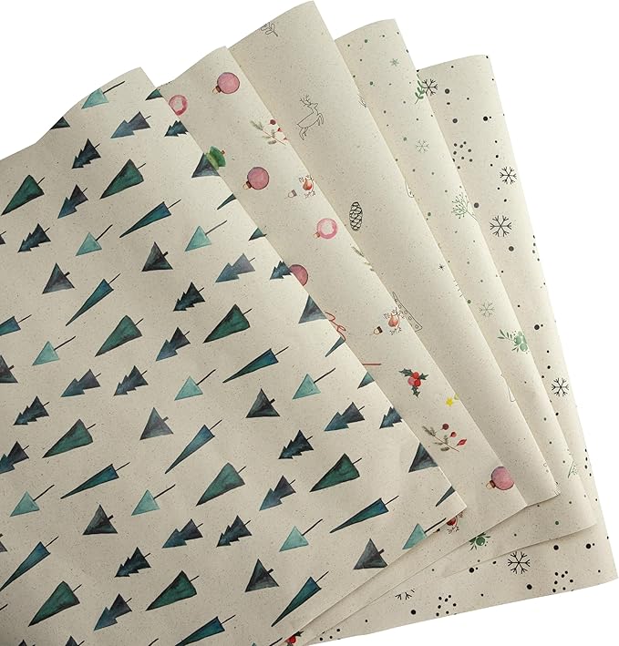 Dieses 5er Geschenkpapier-Set ist die konsequente Investition in eine Zero-Waste-Weihnachtszeit. Das Papier ist aus recycelbaren und erneuerbaren Materialien gefertigt und kann nach Gebrauch problemlos recycelt werden, was den unnötigen Müll stark reduziert. Die robuste Kraftpapier-Qualität macht das Papier besonders reißfest und stabil. Die Nachhaltiges Geschenkpapier wird in Europa hergestellt (kurze Transportwege). Das Design ist eine stilvolle Vintage-Kollektion mit dezenten Naturmustern, die Ihre Geschenke elegant und knitterfrei in Szene setzt.